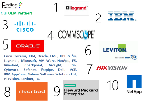 Pedicel have OEM partners; Cisco Systems, IBM, Oracle, EMC, HPE & hp, Legrand, Microsoft, VMWare, NetApp, F5, Riverbed, Checkpoint, Arcsight, Tufin, Cyberack, Safenet, Fatpipe, Dell, VCE, IBM, AppZone, Nahere Ltd. With an experienced team of professionals in the industry we give you the best of IT solutions, IT support and IT consulting.